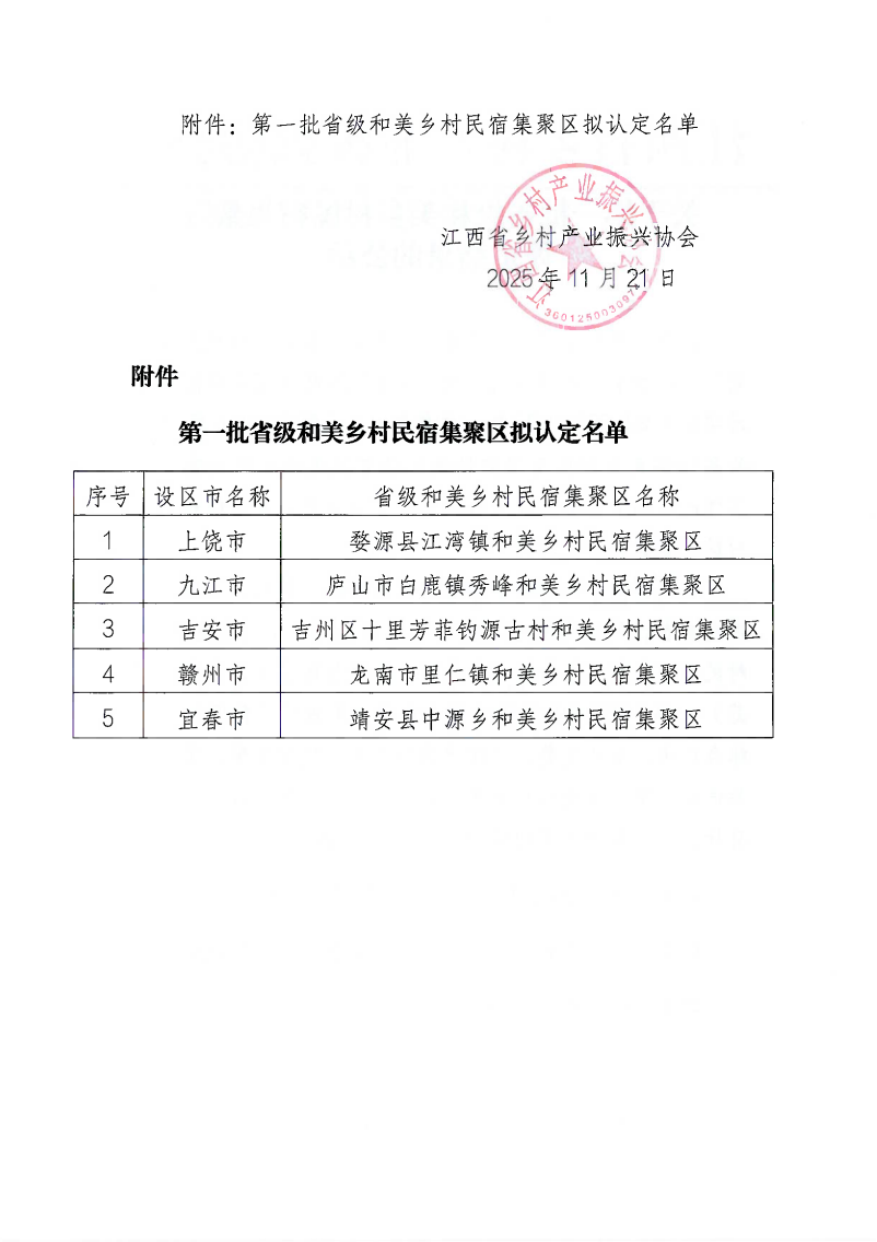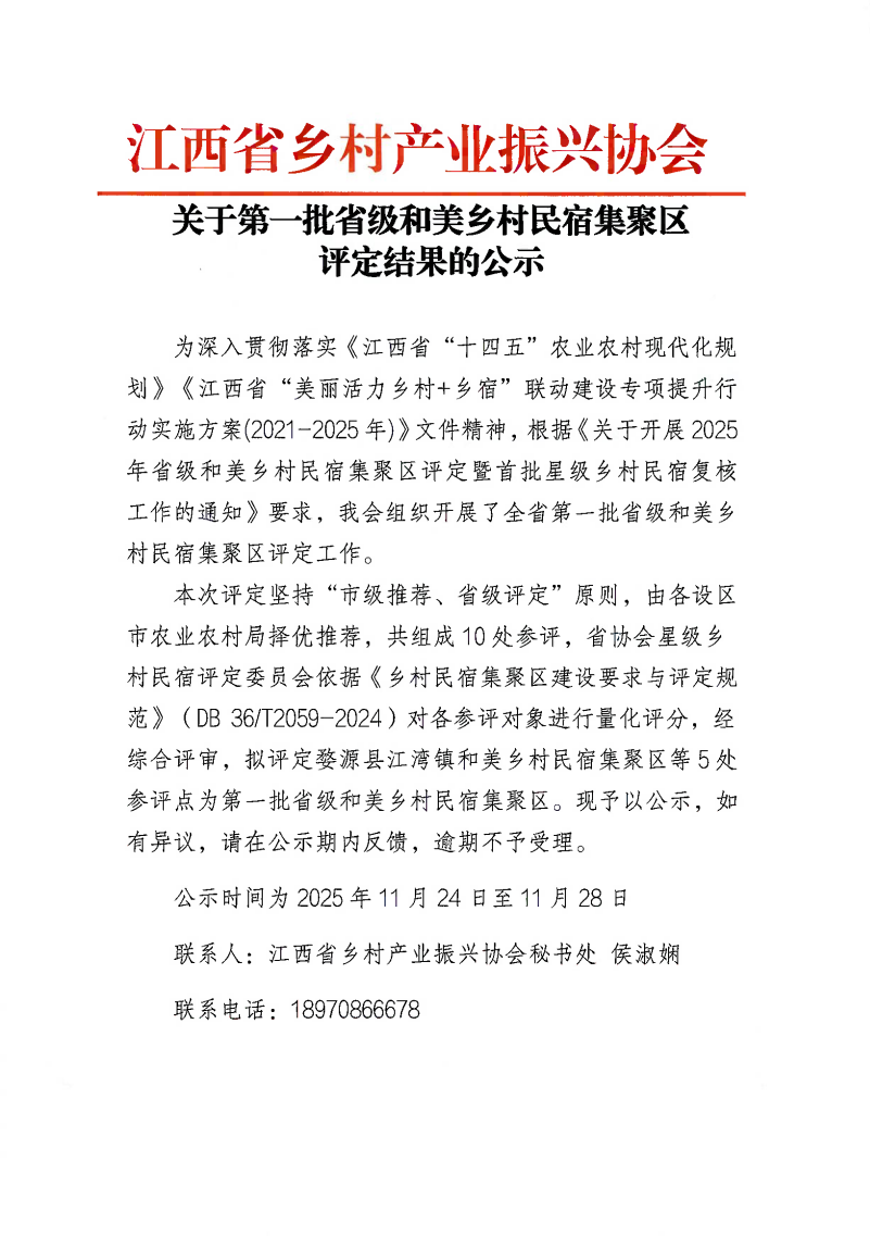 为深入贯彻落实《江西省“十四五”农业农村现代化规划》《江西省“美丽活力乡村+乡宿”联动建设专项提升行动实施方案(2021-2025 年)》文件精神,江西省乡村产业振兴协会(以下简称“省协会”)组织开展了全省第一批省级和美乡村民宿集聚区评定工作,现将拟认定名单公示如下: