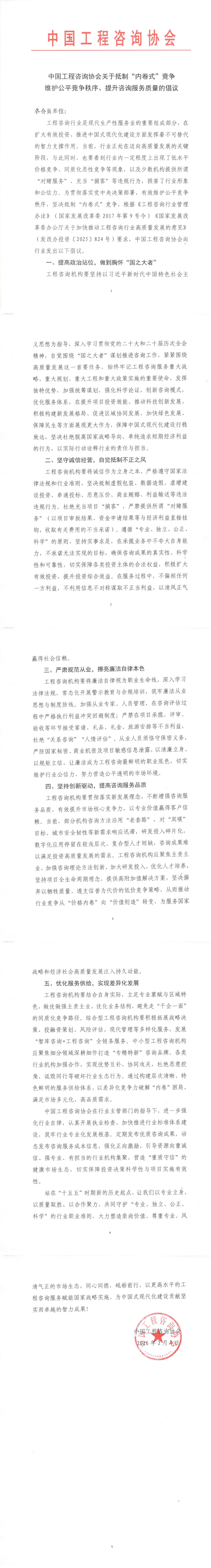 中国工程咨询协会关于抵制“内卷式”竞争 维护公平竞争秩序、提升咨询服务质量的倡议
